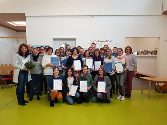 In diesem Wintersemester schlossen 26 Teilnehmer den Montessori Diplom-Lehrgang 2016-2018 in Trägerschaft des Montessori- Landesverbandes NRW erfolgreich mit dem nationalen Montessori-Diplom ab. Zwei Jahre bereiteten sich Lehrer, Erzieher, Heilpädagogen und Studenten in Wochenendseminaren hierauf vor. Die neu ausgebildeten Montessori-Pädagogen freuen sich, den aktuellen Herausforderungen und bildungspolitischen Ansprüchen neu zu begegnen, und die Kinder im Sinne der Montessori-Pädagogik individuell fördern zu können. Eine der Teilnehmer, Barbara Klüsener, Rektorin der Käthe Kollwitz Grundschule in Marl und drei Ihrer Kolleginnen sind überzeugt, dass Montessori- Konzept nun in ihrer staatl. Grundschule weiter kompetent umzusetzen.